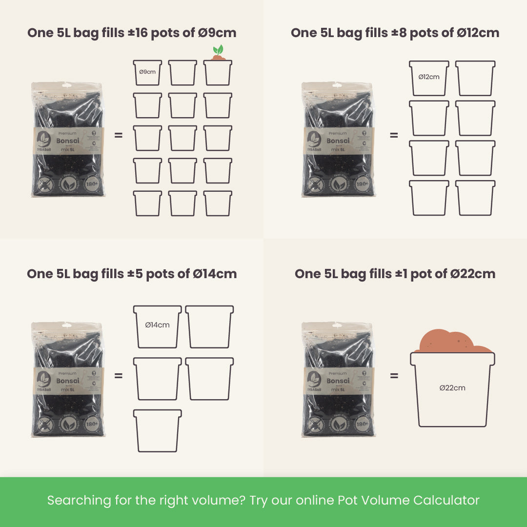 Kolla in detta krukvolymkalkylator verktyg för att beräkna hur mycket Bonsaijord du behöver.