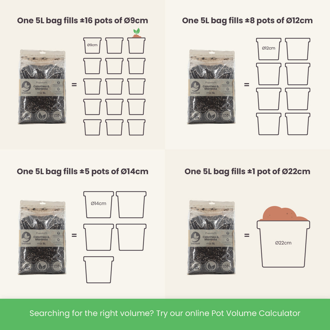 Kolla in detta krukvolymkalkylator verktyg för att beräkna hur mycket Calathea & Marantajord du behöver.